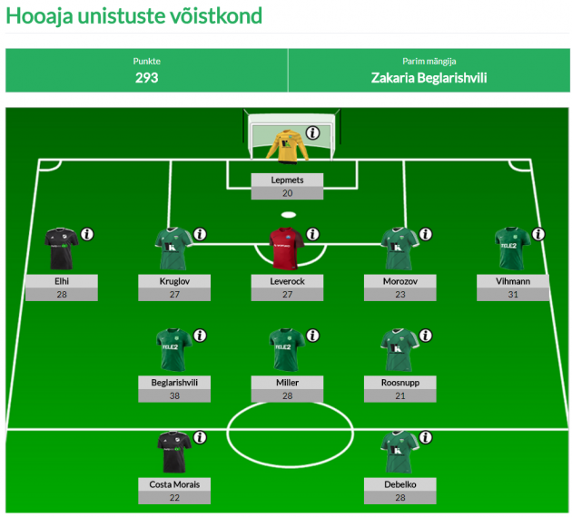 Keda siis edukad Fantasy-mängijad usaldavad? Unistuste meeskonnas teeb taas ilma Zakaria Beglarišvili (38 punkti) ja grusiin on ülekaalukalt ka liiga enim hoitud mängija, teda omab meeskonnas koguni 77,1% kõigist mängijatest. Üle poolte mängijate usalduse on ära teeninud veel vaid Rimo Hunt (63,2%) ja Dmitri Kruglov (63,1%). Unistuste võistkonda vaadates saab aga kinnitust, et tänavu on hinnas kaitsjad - hetkel rivistuvad enim punkte teeninud mehed üles 5-3-2 formatsioonis.